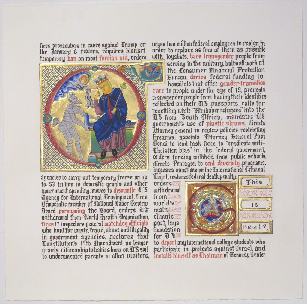 When I stumbled into this rather neglected art form, my manuscripts reflected my intense desire to communicate something of our radically changed lives. Now in 2024, working in my new studio on the top floor of my house as I write this, I see how they allow me to give expression to melancholy subjects, political frustrations, and the lunacy of everyday life.