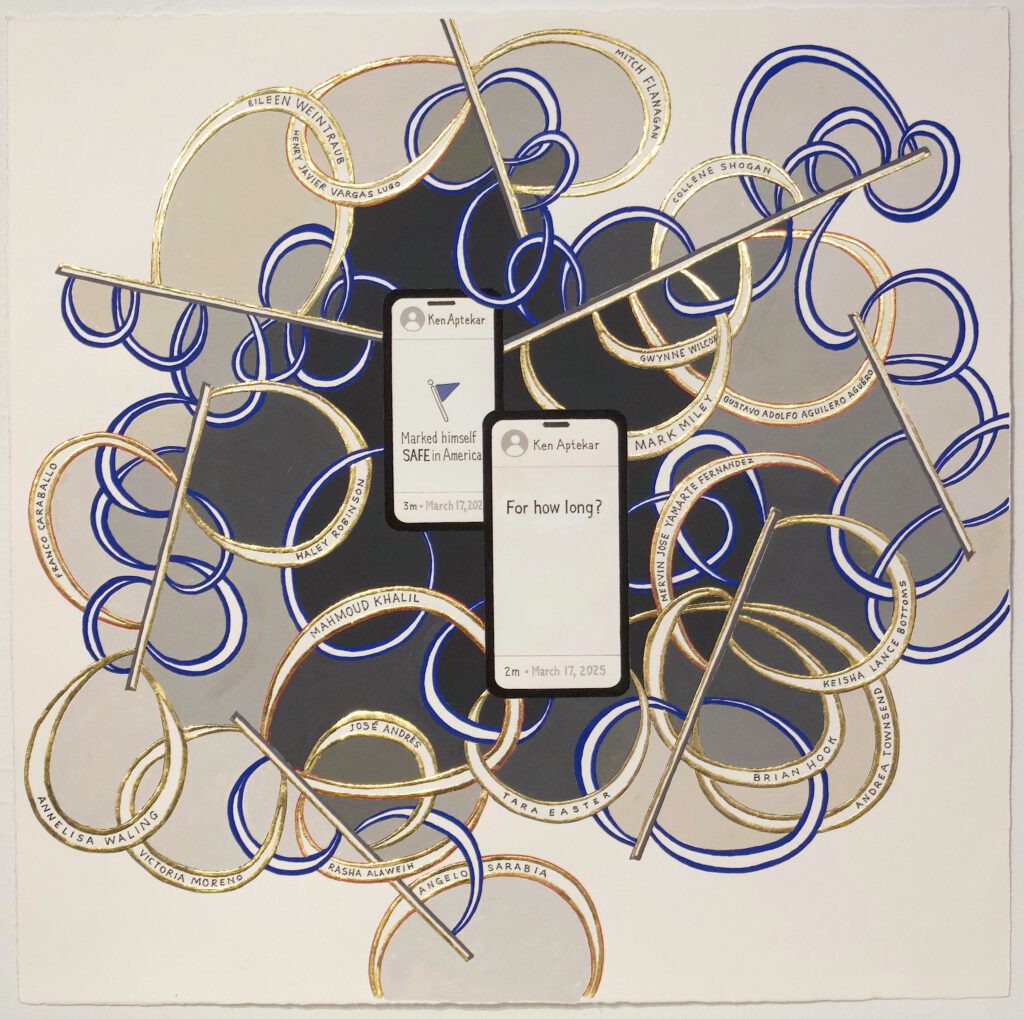 [Text exchange between Ken Aptekar & Emma Lazarus who wrote the poem, The New Colossus, 1883, which is inscribed on the base of the Statue of Liberty, designed by French sculptor Frederic-August Bartholdi.]TEXT: Ken Aptekar is at Statue of Liberty January 20, 2025