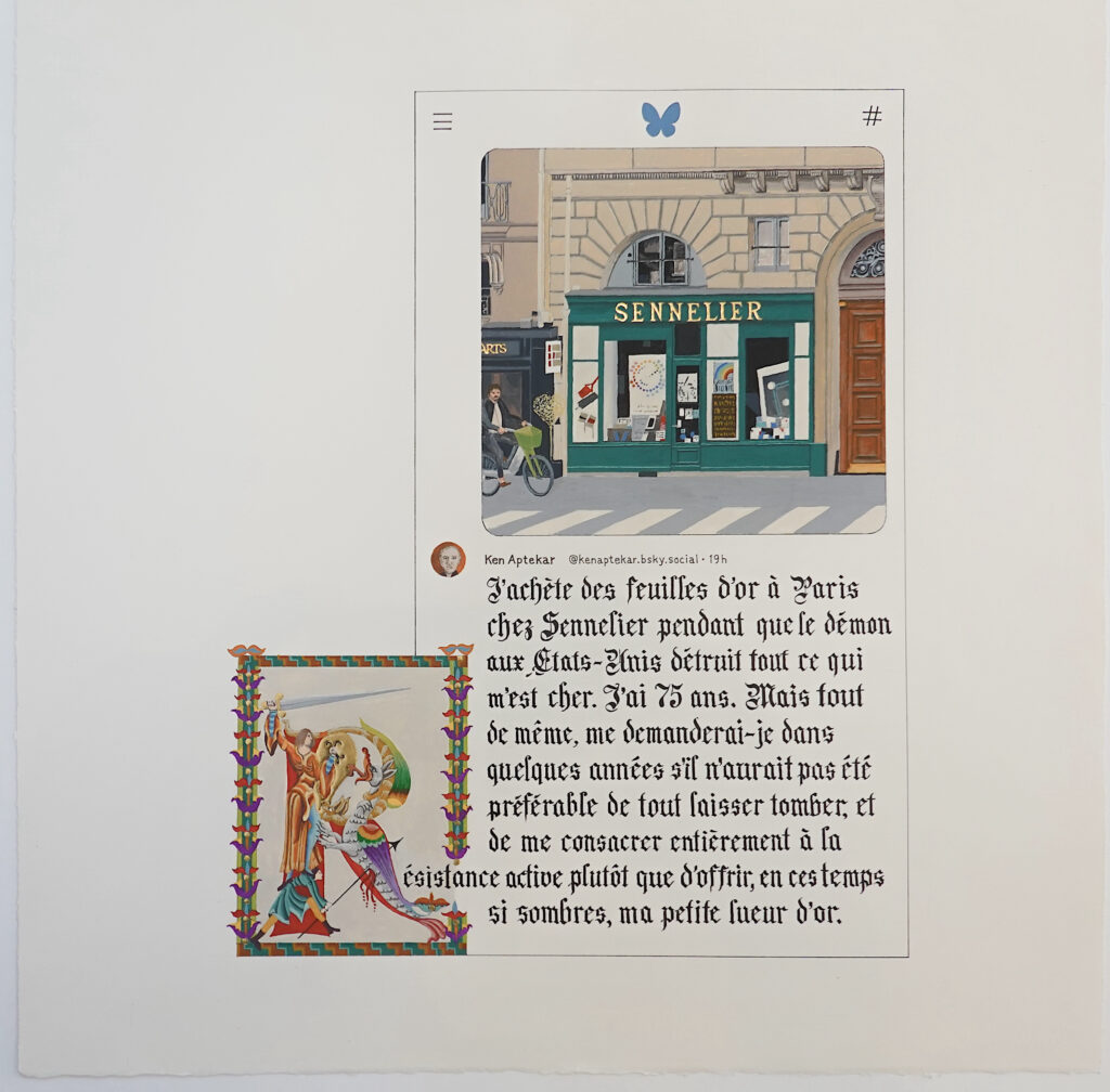 TEXT: J’achete des feuilles d’or a Paris chez Sennelier pendant que le demon aux Etats-Unis detruit tout ce qui m’est cher. J’ai 75 ans. Mais tout de meme, me demanderai-je dans quelques annees s’il n’aurait pas ete preferable de tout laisser tomber, et de me consacrer entierement a la Resistance active plutot que d’offrir, en ces temps si sombres, ma petite lueur d’or.