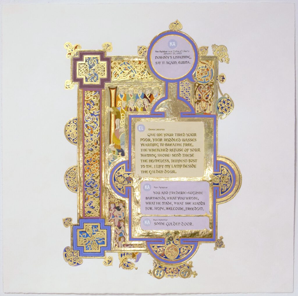 [Text exchange between Ken Aptekar & Emma Lazarus who wrote the poem, The New Colossus, 1883, which is inscribed on the base of the Statue of Liberty, designed by French sculptor Frederic-August Bartholdi.]TEXT: Ken Aptekar is at Statue of Liberty January 20, 2025